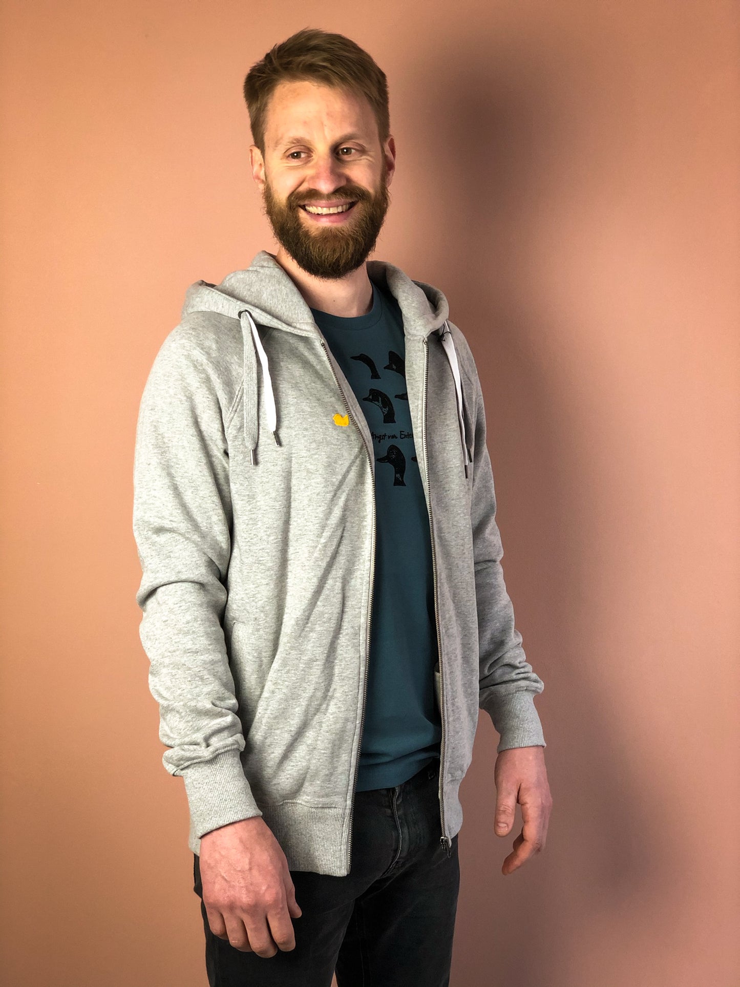 Super flauschige Sweatjacke mit gelben Enten Motiv aus Biobaumwolle in einem tollem grau meliert von naaknaak